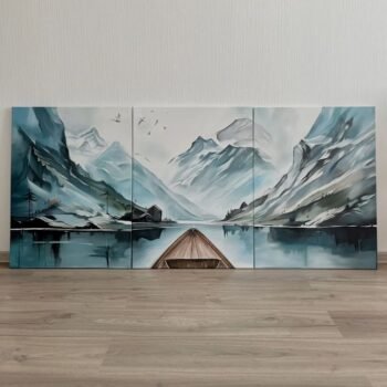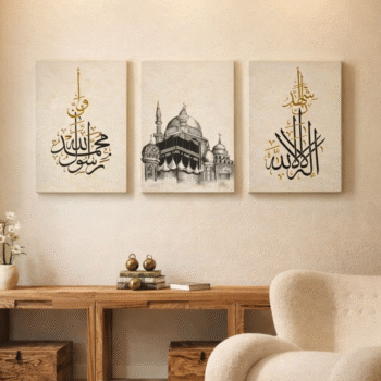 Mosque Illustration & Arabic Calligraphy – 3-Piece Digital Print on Wooden Phototiles