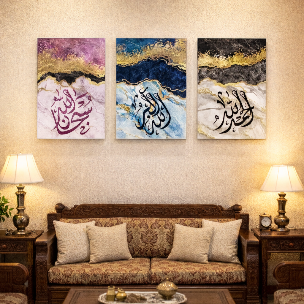 Enhance your interiors with this elegant Set of 3 Islamic Calligraphy Sticky Photo Tile Wall Frames, featuring the timeless phrases SubhanAllah, Alhamdulillah, and Allahu Akbar—designed to bring peace, faith, and refined beauty to your space.